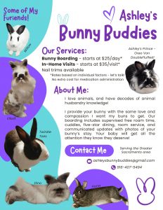 Going on vacation but can’t take Snicker Doodle Bun with you? While we don’t offer boarding services, we do have a fabulous rabbit savvy volunteer who provides boarding services. Your bunny will be safe, secure and spoiled while in the care of Ashley’s Bunny Buddies.